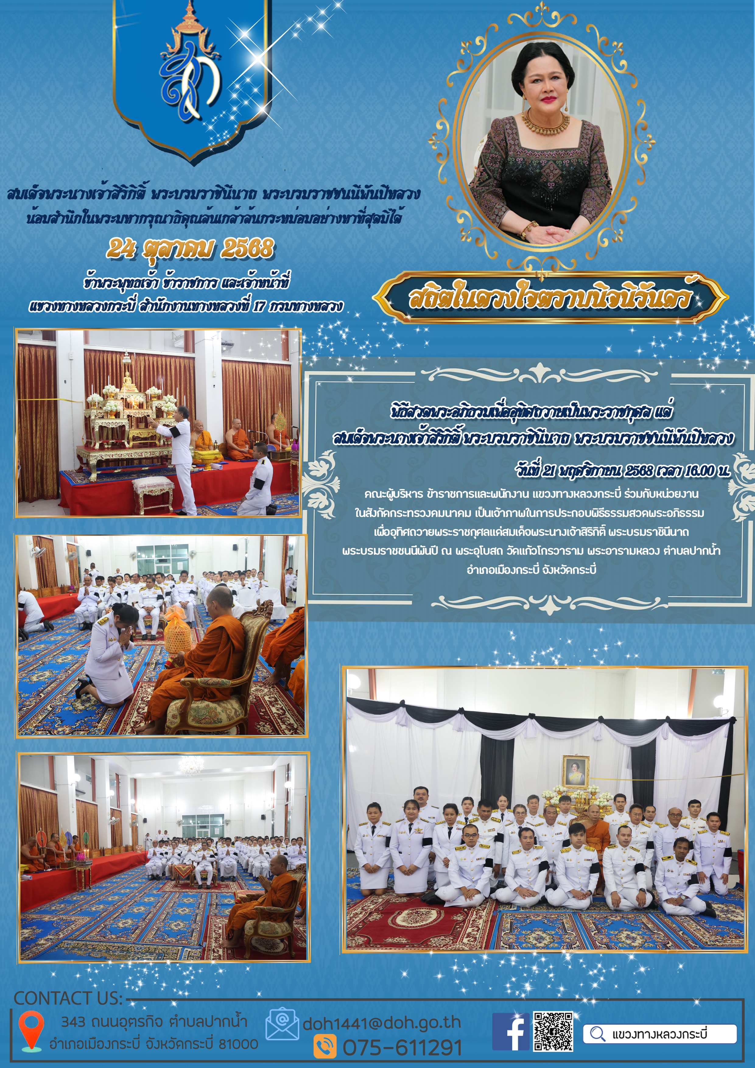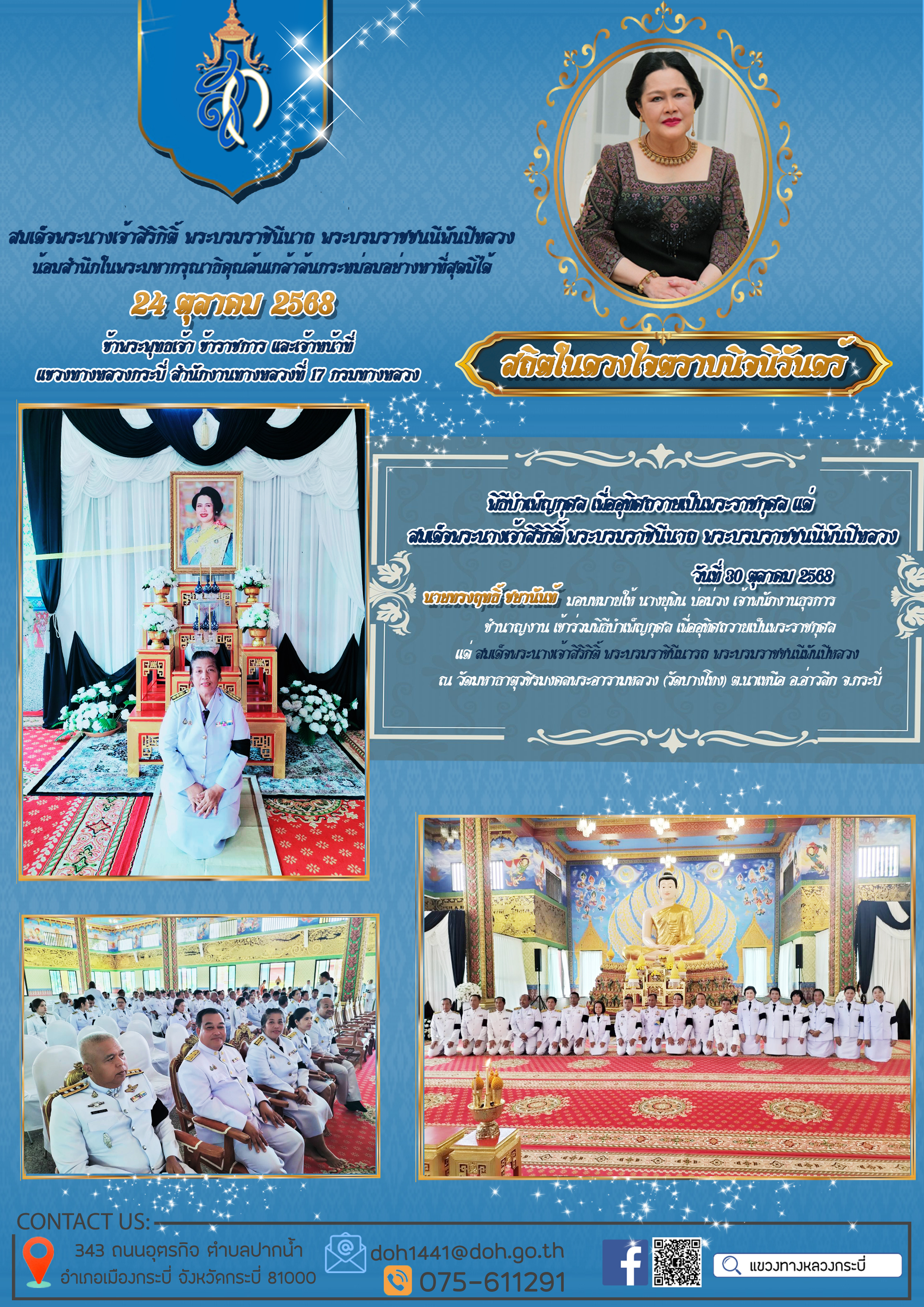 แขวงทางหลวงกระบี่ ร่วมกับหน่วยงานในสังกัดกระทรวงคมนาคมเป็นเจ้าภาพในการประกอบพิธีธรรมสวดพระอภิธรรม เพื่ออุทิศถวายพระราชกุศลแด่สมเด็จพระนางเจ้าสิริกิติ์ พระบรมราชินีนาถ พระบรมราชชนนีพันปีหลวง