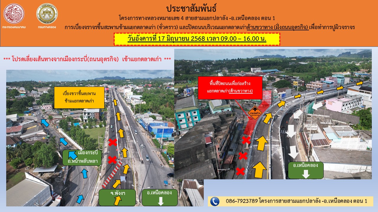 แจ้งปิดการจราจรเป็นการชั่วคราว โครงการก่อสร้างทางหลวงหมายเลข 4 สายสามแยกปลาลัง-อ.เหนือคลอง บริเวณสะพานยกระดับตลาดเก่า