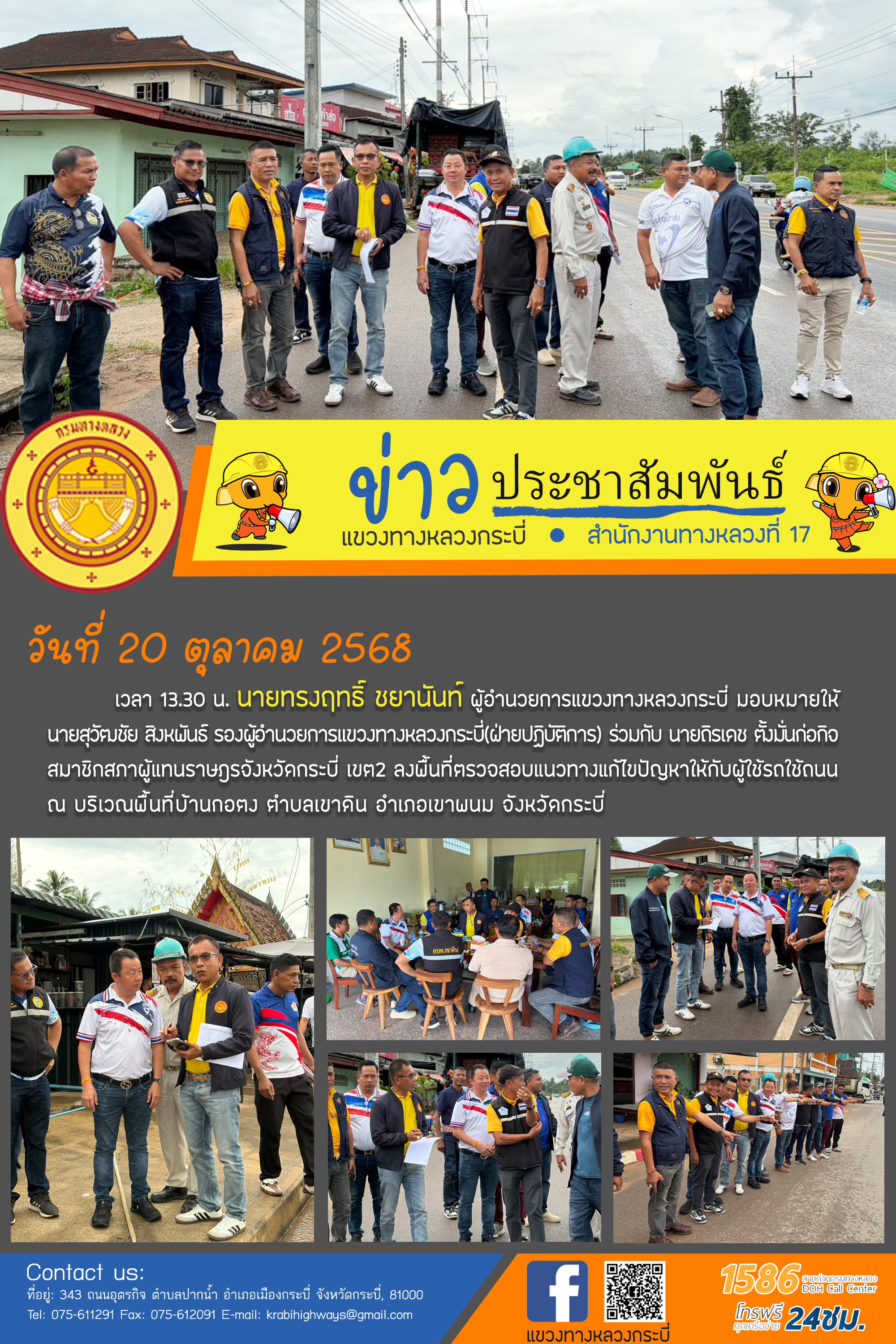 นายสุวัฒชัย สิงหพันธ์ รองผู้อำนวยการแขวงทางหลวงกระบี่(ฝ่ายปฏิบัติการ) ลงพื้นที่ตรวจสอบแนวทางแก้ไขปัญหาให้กับผู้ใช้รถใช้ถนน
