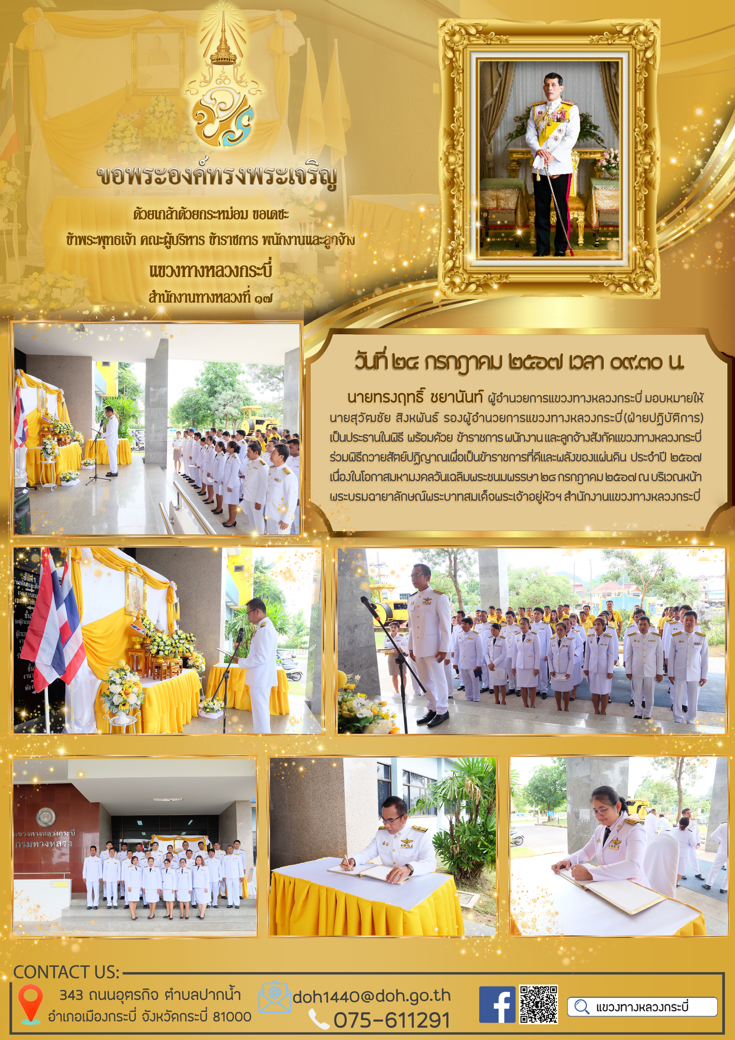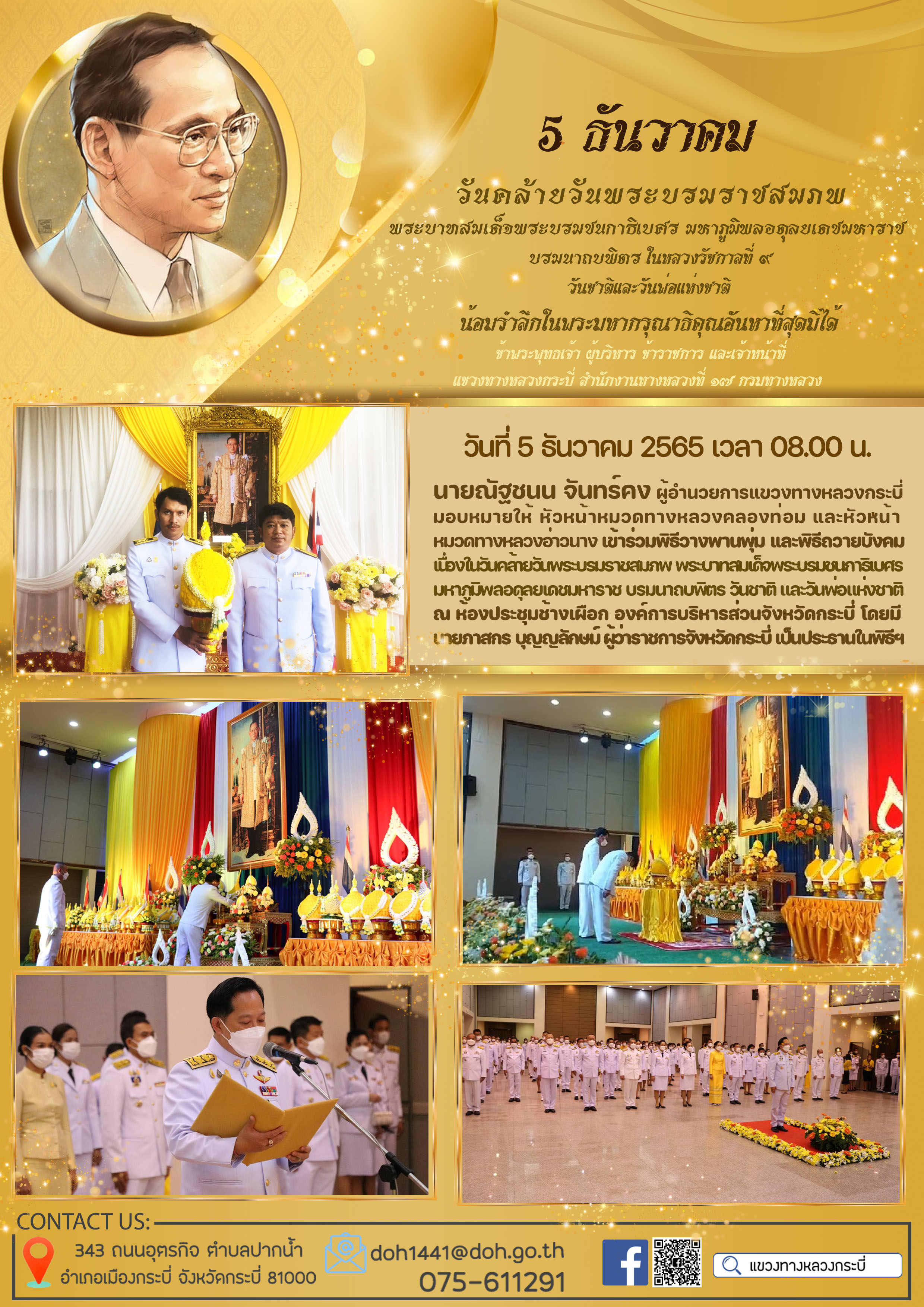 แขวงทางหลวงกระบี่ เข้าร่วมกิจกรรมวางพานพุ่ม และพิธีถวายบังคม พระบาทสมเด็จพระบรมชนกาธิเบศร มหาภูมิพลอดุลยเดชมหาราช บรมนาถบพิตร ในหลวงรัชกาลที่ ๙ วันชาติและวันพ่อแห่งชาติ