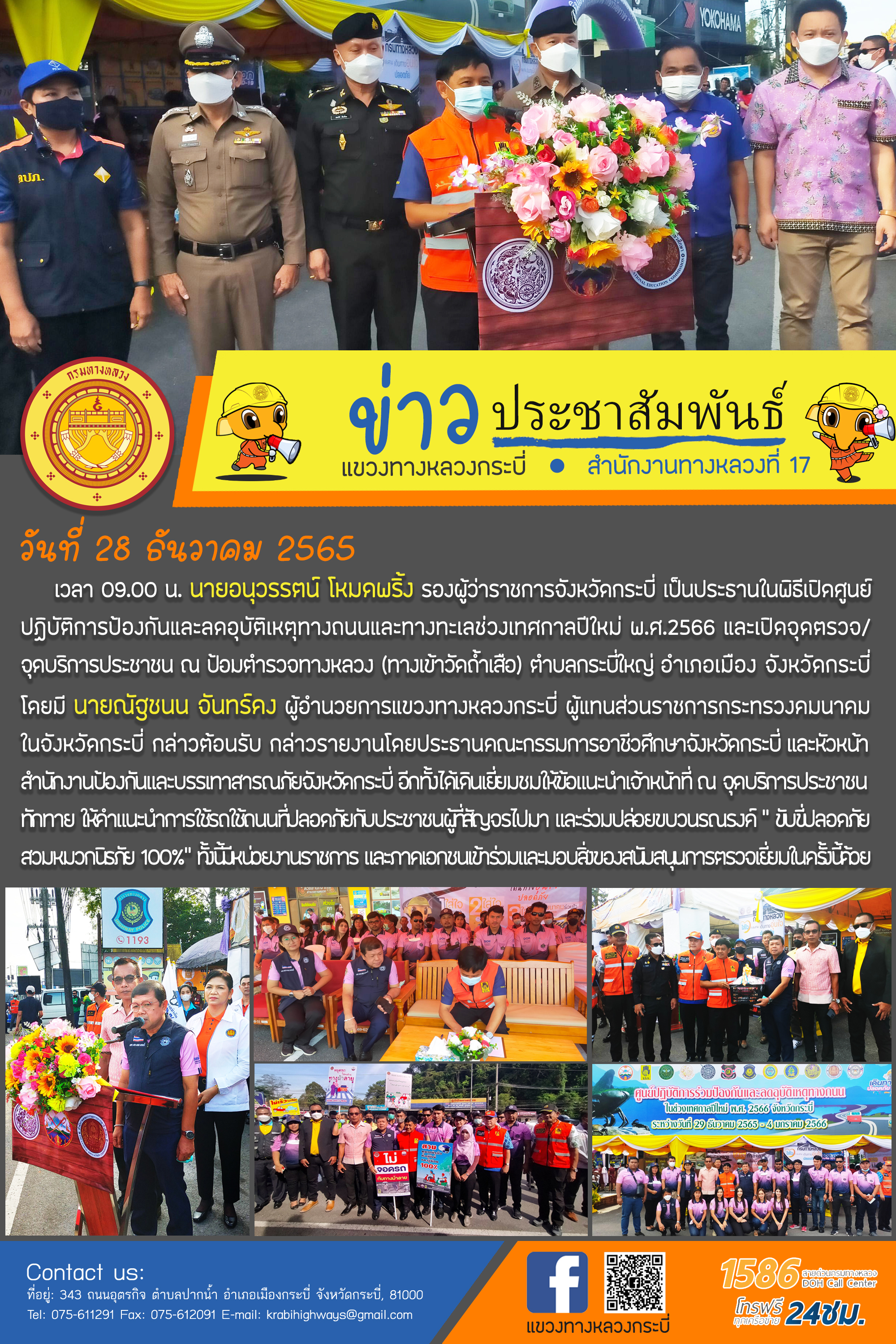 แขวงทางหลวงกระบี่ ร่วมพิธีเปิดศูนย์ ปฏิบัติการป้องกันและลดอุบัติเหตุทางถนนและทางทะเลช่วงเทศกาลปีใหม่ พ.ศ.2566