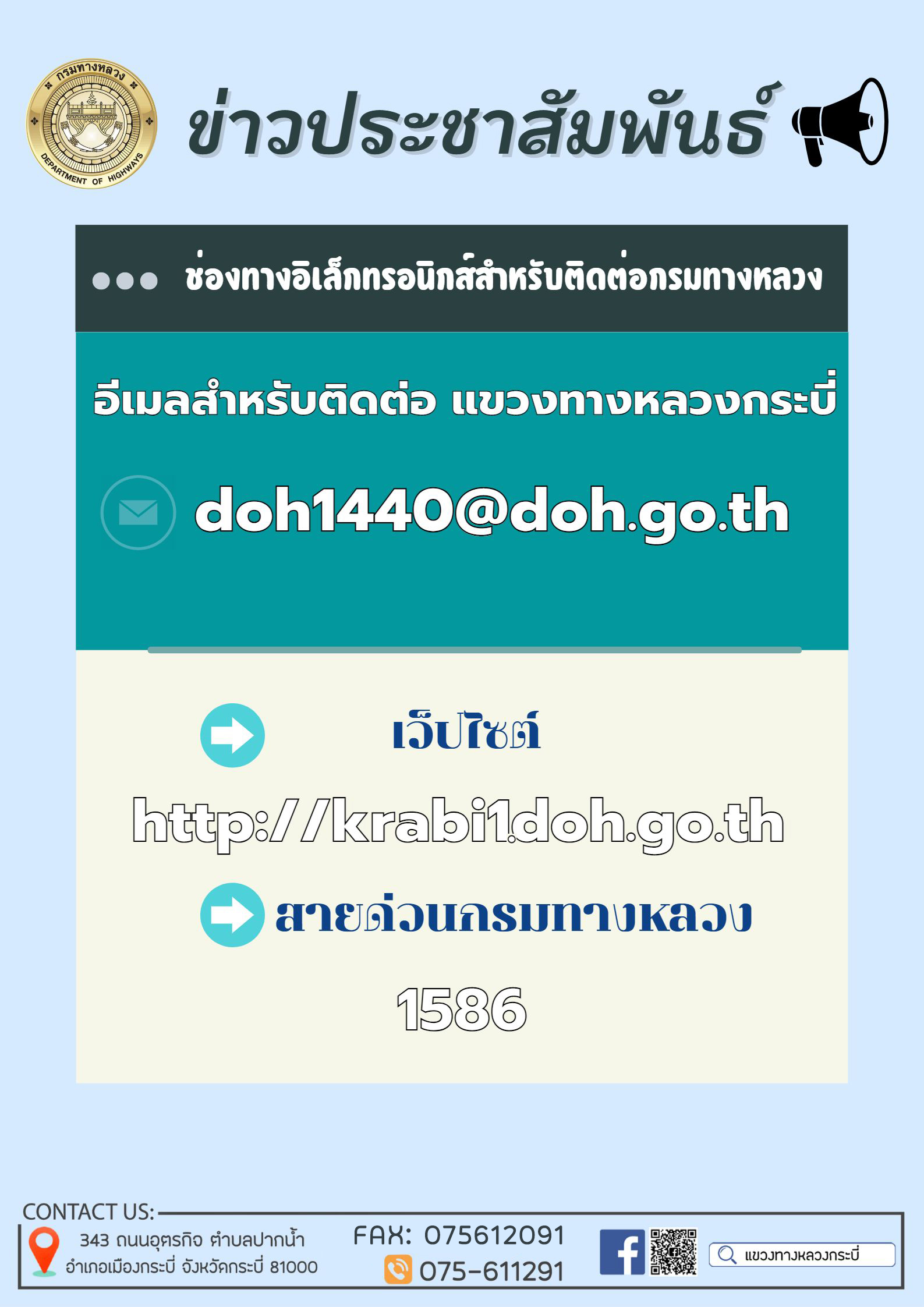 ช่องทางอิเล็กทรอนิกส์สำหรับติดต่อกรมทางหลวง อีเมลสำหรับติดต่อ แขวงทางหลวงกระบี่(สำนักงานทางหลวงที่ 17)