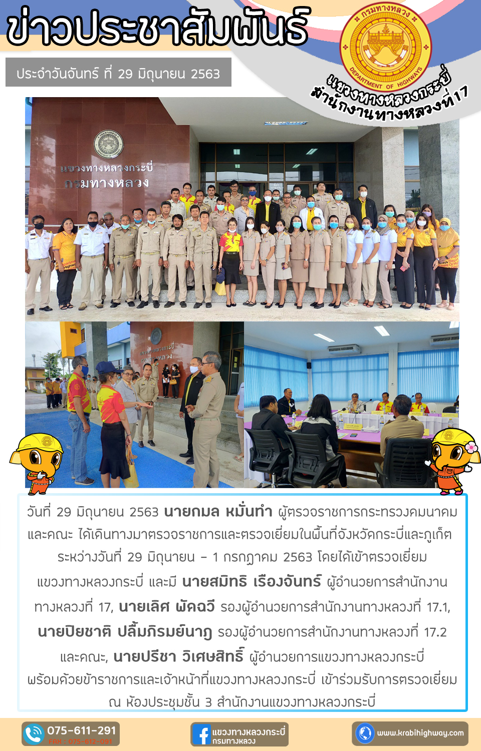 วันที่ 29 มิถุนายน 2563 นายกมล หมั่นทำ ผู้ตรวจราชการกระทรวงคมนาคม และคณะ ได้เดินทางมาตรวจราชการและตรวจเยี่ยมในพื้นที่จังหวัดกระบี่และภูเก็ต ระหว่างวันที่ 29 มิถุนายน - 1 กรกฏาคม 2563 โดยได้เข้าตรวจเยี่ยม แขวงทางหลวงกระบี่ และมี นายสมิทธิ เรืองจันทร์ ผู้อำนวยการสำนักงาน ทางหลวงที่ 17, นายเลิศ พัดฉวี รองผู้อำนวยการสำนักงานทางหลวงที่ 17.1, นายปิยชาติ ปลื้มภิรมย์นาฎ รองผู้อำนวยการสำนักงานทางหลวงที่ 17.2 และคณะ, นายปรีชา วิเศษสิทธิ์ ผู้อำนวยการแขวงทางหลวงกระบี่ พร้อมด้วยข้าราชการและเจ้าหน้าที่แขวงทางหลวงกระบี่ เข้าร่วมรับการตรวจเยี่ยม ณ ห้องประชุมชั้น 3 สำนักงานแขวงทางหลวงกระบี่