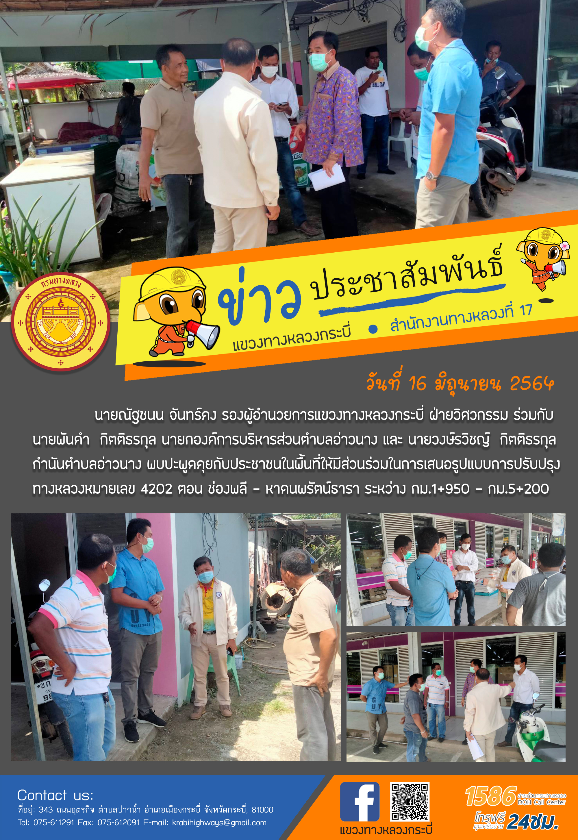 วันที่ 16 มิถุนายน นายณัฐชนน จันทร์คง รองผู้อำนวยการแขวงทางหลวงกระบี่ ฝ่ายวิศวกรรม ร่วมกับ นายพันคำ กิตติธรกุล นายกองค์การบริหารส่วนตำบลอ่าวนาง และ นายวงษ์รวิชญ์ กิตติธรกุล กำนันตำบลอ่าวนาง พบปะพูดคุยกับประชาชนในพื้นที่ให้มีส่วนร่วมในการเสนอรูปแบบการปรับปรุง ทางหลวงหมายเลข 4202 ตอน ช่องพลี - หาดนพรัตน์ธารา ระหว่าง กม.1+950 - กม.5+200