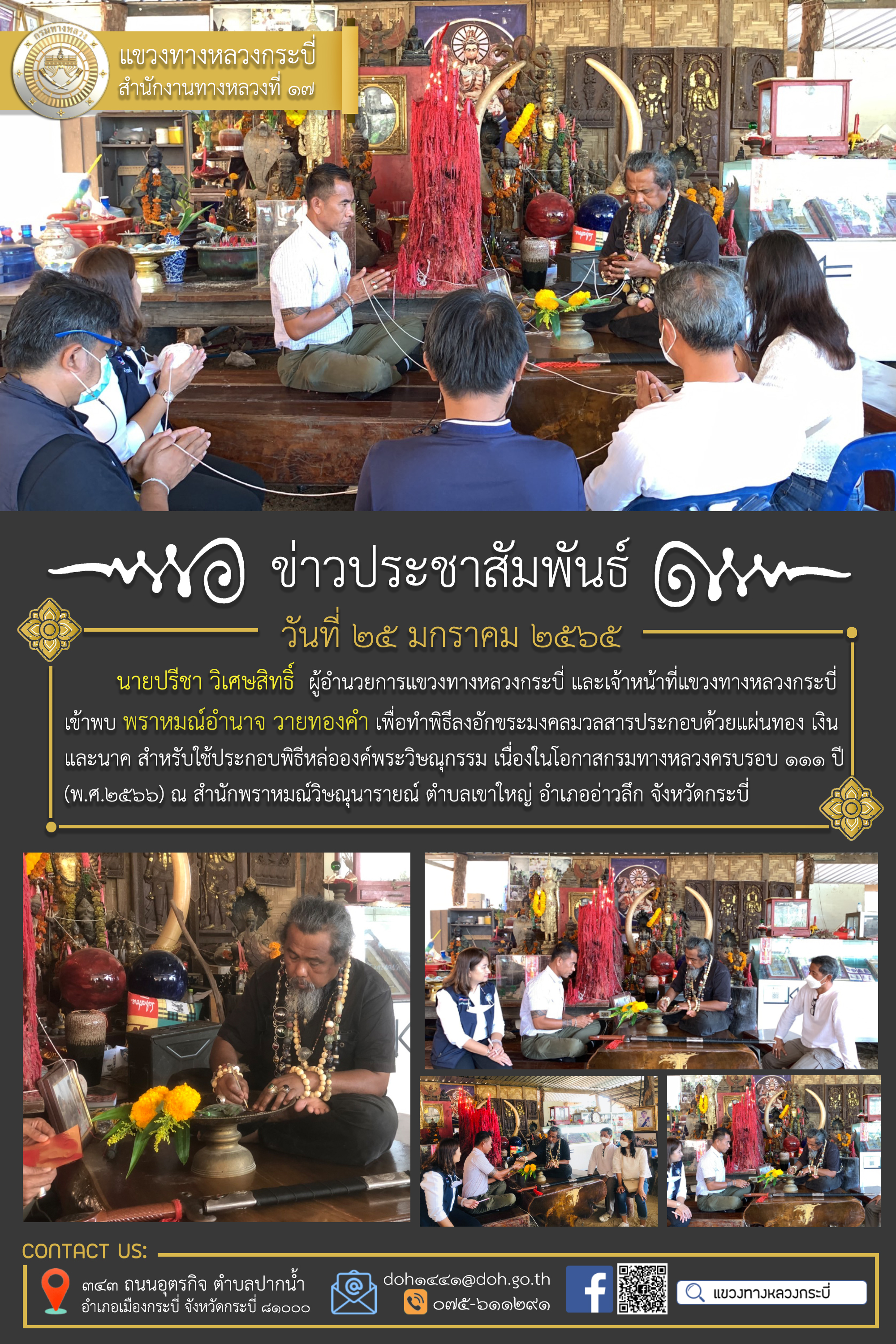วันที่ 25 มกราคม 2565 นายปรัชา วิเศษสิทธิ์ ผู้อำนวยการแขวงทางหลวงกระบี่ เข้าพบ พราหมณ์อำนาจ วายทองคำ เพื่อทำพิธีลงอักขระมวลสาร ซึ่งประด้วย แผ่นทอง เงิน และ นาค สำหรับใช้ประกอบพิธีหล่อองค์พระวิษณุกรรม เนื่องในโอกาสกรมทางหลวง ครบรอบ 111 ปี (พ.ศ.2566) ณ สำนักพราหมณ์วิษณุนารายณ์ ตำบลเขาใหญ่ อำเภออ่าวลึก จังหวัดกระบี่
