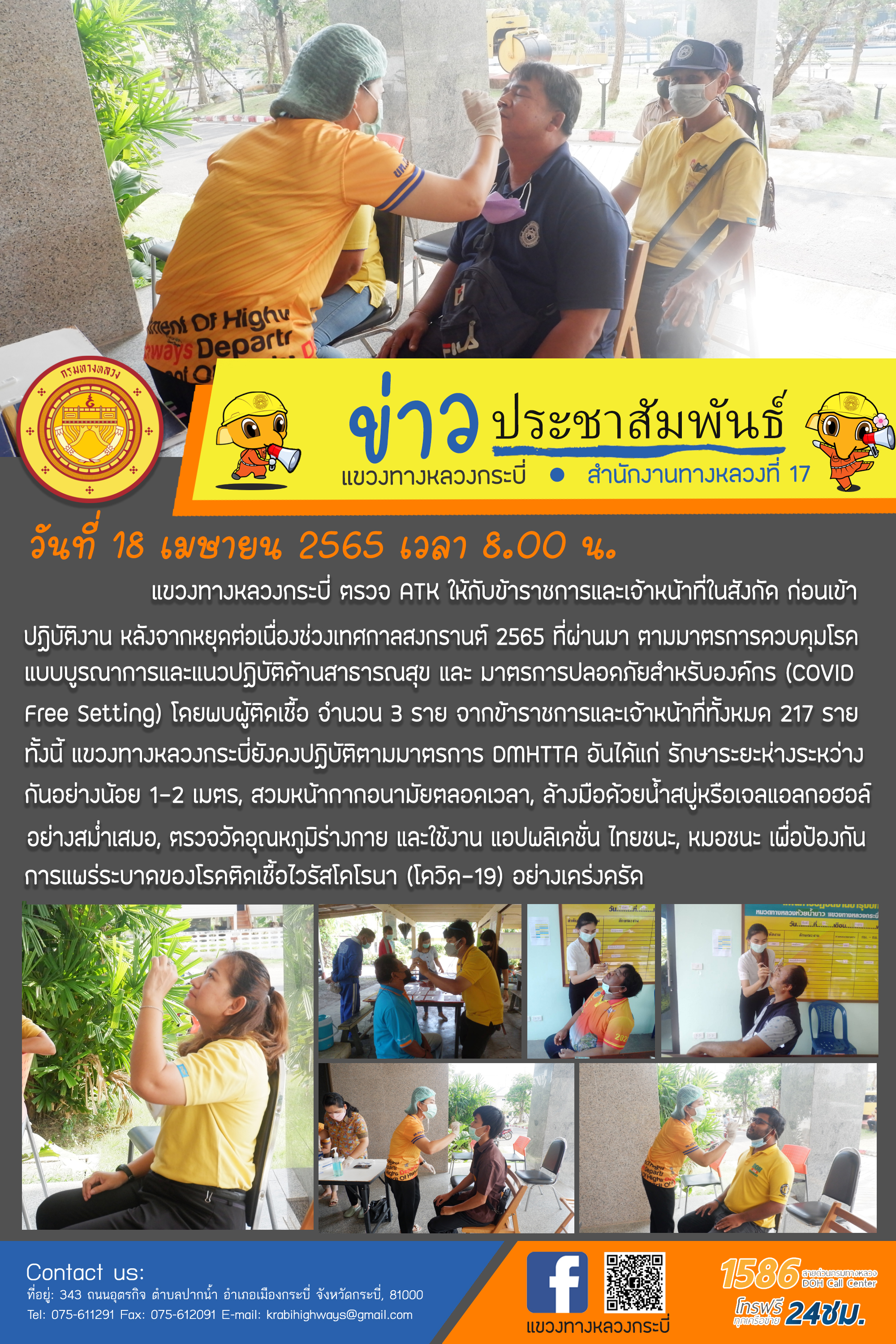 วันที่ 18 เมษายน 2565 เวลา 08.00 น. แขวงทางหลวงกระบี่ ตรวจ ATK ให้กับข้าราชการและเจ้าหน้าที่ในสังกัด ก่อนเข้าปฏิบัติงาน หลังจากหยุดต่อเนื่องช่วงเทศกาลสงกรานต์ 2565 ที่ผ่านมา ตามมาตรการควบคุมโรคแบบบูรณาการและแนวปฏิบัติด้านสาธารณสุข และ มาตรการปลอดภัยสำหรับองค์กร (COVID Free Setting) โดยพบผู้ติดเชื้อ จำนวน 3 ราย จากข้าราชการและเจ้าหน้าที่ทั้งหมด 217 ราย ทั้งนี้ แขวงทางหลวงกระบี่ยังคงปฏิบัติตามมาตรการ DMHTTA อันได้แก่ รักษาระยะห่างระหว่างกันอย่างน้อย 1-2 เมตร, สวมหน้ากากอนามัยตลอดเวลา, ล้างมือด้วยน้ำสบู่หรือเจลแอลกอฮอล์ อย่างสม่ำเสมอ, ตรวจวัดอุณหภูมิร่างกาย และใช้งาน แอปพลิเคชั่น ไทยชนะ, หมอชนะ เพื่อป้องกันการแพร่ระบาดของโรคติดเชื้อไวรัสโคโรนา (โควิด-19) อย่างเคร่งครัด