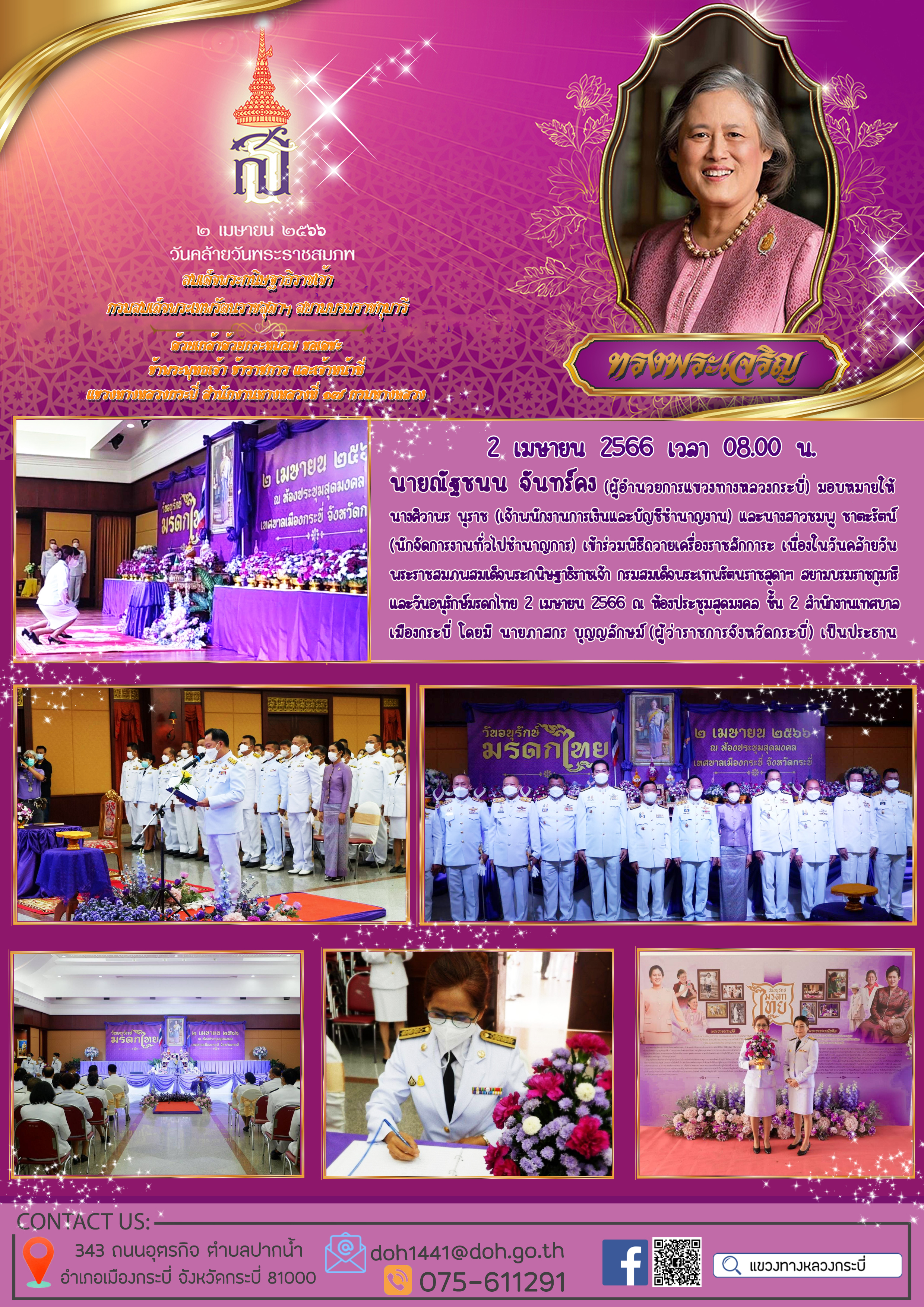 นายณัฐชนน จันทร์คง (ผู้อำนวยการแขวงทางหลวงกระบี่) มอบหมายให้ นางศิวาพร นุราช (เจ้าพนักงานการเงินและบัญชีชำนาญงาน) และนางสาวชมพู ชาตะรัตน์ (นักจัดการงานทั่วไปชำนาญการ) เข้าร่วมพิธีถวายเครื่องราชสักการะ เนื่องในวันคล้ายวัน พระราชสมภพสมเด็จพระกนิษฐาธิราชเจ้า กรมสมเด็จพระเทพรัตนราชสุดาฯ สยามบรมราชกุมารี และวันอนุรักษ์มรดกไทย 2 เมษายน 2566 ณ ห้องประชุมสุดมงคล ชั้น 2 สำนักงานเทศบาล เมืองกระบี่ โดยมี นายภาสกร บุญญลักษม์ (ผู้ว่าราชการจังหวัดกระบี่) เป็นประธาน