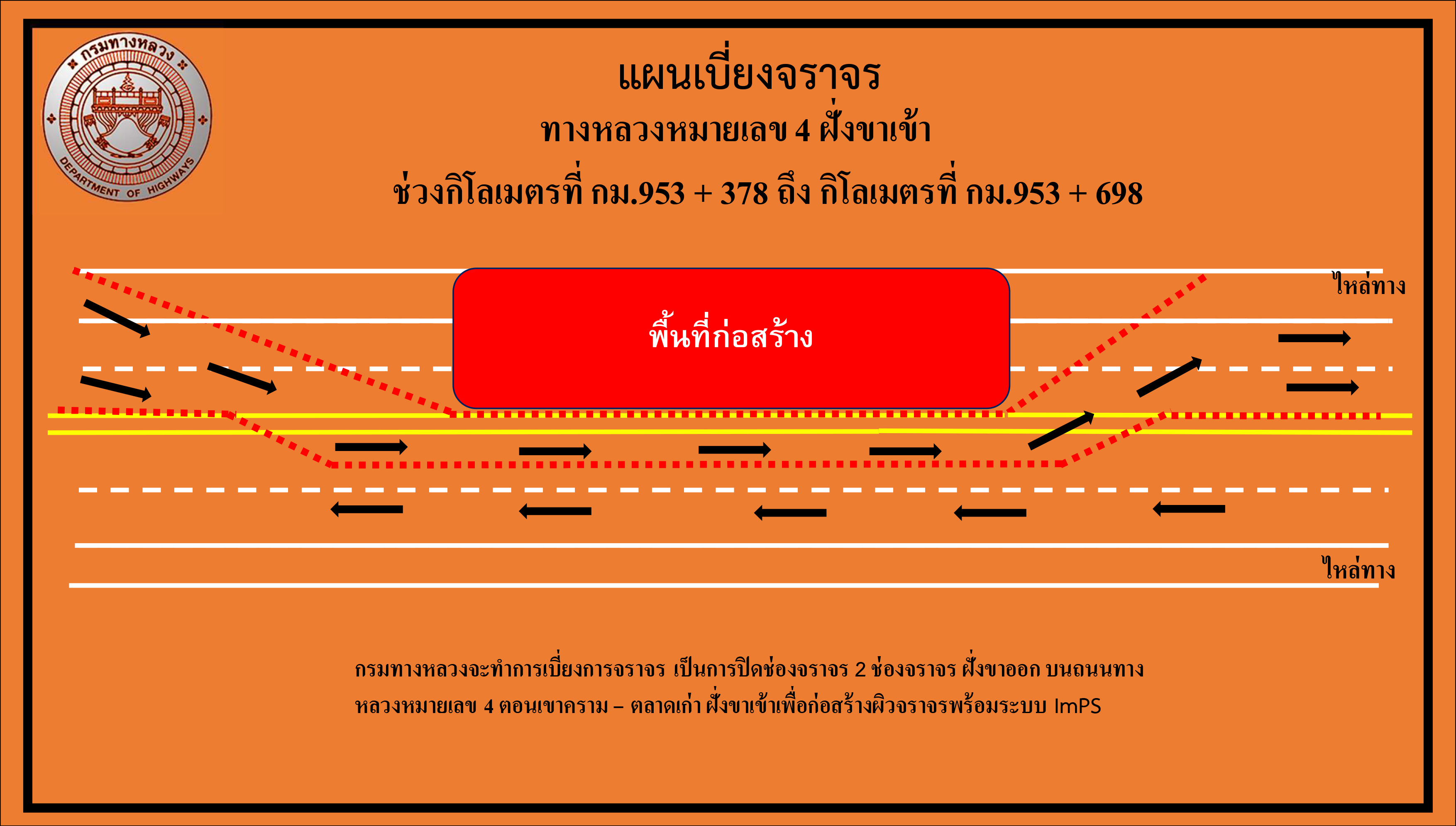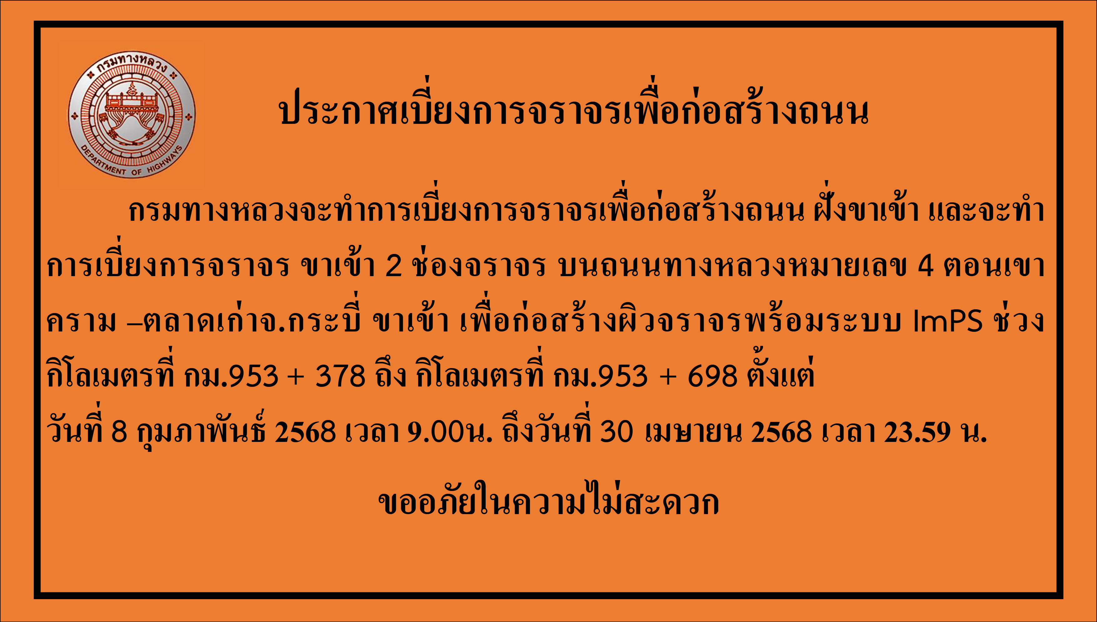 กรมทางหลวงจะทำการเบี่ยงการจราจรเพื่อก่อสร้างถนน ฝั่งขาเข้าและจะทำการเบี่ยงจราจร ขาเข้า 2 ช่องจราจร บนถนนทางหลวงหมายเลข 4 ตอน เขาคราม-ตลาดเก่า จ.กระบี่ ขาเข้า เพื่อก่อสร้างผิวจราจรพร้อมระบบ ImPS ช่วงกิโลเมตรที่ กม. 953+378 - กม. 953+698 ตั้งแต่วันที่ 8 กุมภาพันธ์ 2568 เวลา 9.00 น. - วันที่ 30 เมษายน 2568 เวลา 23.59 น.