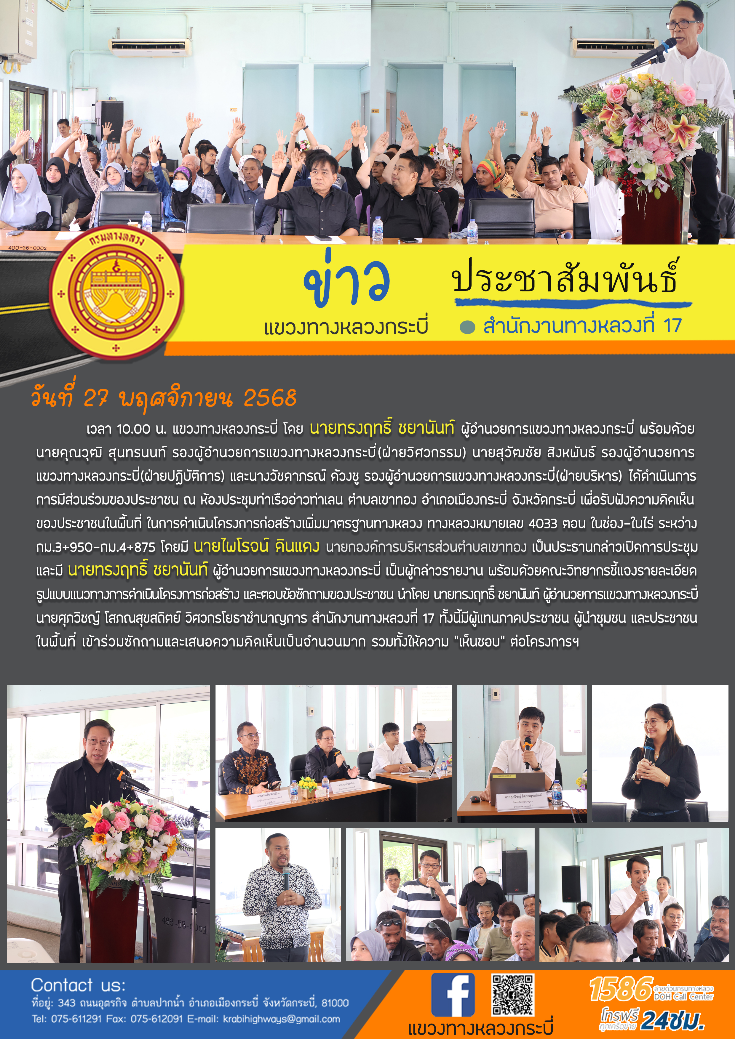 เวลา 10.00 น. แขวงทางหลวงกระบี่ โดย นายทรงฤทธิ์ ชยานันท์ ผู้อำนวยการแขวงทางหลวงกระบี่ พร้อมด้วย นายคุณวุฒิ สุนทรนนท์ รองผู้อำนวยการแขวงทางหลวงกระบี่(ฝ่ายวิศวกรรม) นายสุวัฒชัย สิงหพันธ์ รองผู้อำนวยการ แขวงทางหลวงกระบี่(ฝ่ายปฏิบัติการ) และนางวัชดาภรณ์ ด้วงชู รองผู้อำนวยการแขวงทางหลวงกระบี่(ฝ่ายบริหาร) ได้ดำเนินการ การมีส่วนร่วมของประชาชน ณ ห้องประชุมท่าเรืออ่าวท่าเลน ตำบลเขาทอง อำเภอเมืองกระบี่ จังหวัดกระบี่ เพื่อรับฟังความคิดเห็น ของประชาชนในพื้นที่ ในการดำเนินโครงการก่อสร้างเพิ่มมาตรฐานทางหลวง ทางหลวงหมายเลข 4033 ตอน ในช่อง-ในไร่ ระหว่าง กม.3+950-กม.4+875 โดยมี นายไพโรจน์ ดินแดง นายกองค์การบริหารส่วนตำบลเขาทอง เป็นประธานกล่าวเปิดการประชุม และมี นายทรงฤทธิ์ ชยานันท์ ผู้อำนวยการแขวงทางหลวงกระบี่ เป็นผู้กล่าวรายงาน พร้อมด้วยคณะวิทยากรชี้แจงรายละเอียด รูปแบบแนวทางการดำเนินโครงการก่อสร้าง และตอบข้อซักถามของประชาชน นำโดย นายทรงฤทธิ์ ชยานันท์ ผู้อำนวยการแขวงทางหลวงกระบี่ นายศุภวิชญ์ โสภณสุขสถิตย์ วิศวกรโยธาชำนาญการ สำนักงานทางหลวงที่ 17 ทั้งนี้มีผู้แทนภาคประชาชน ผู้นำชุมชน และประชาชน ในพื้นที่ เข้าร่วมซักถามและเสนอความคิดเห็นเป็นจำนวนมาก รวมทั้งให้ความ ”เห็นชอบ” ต่อโครงการฯ