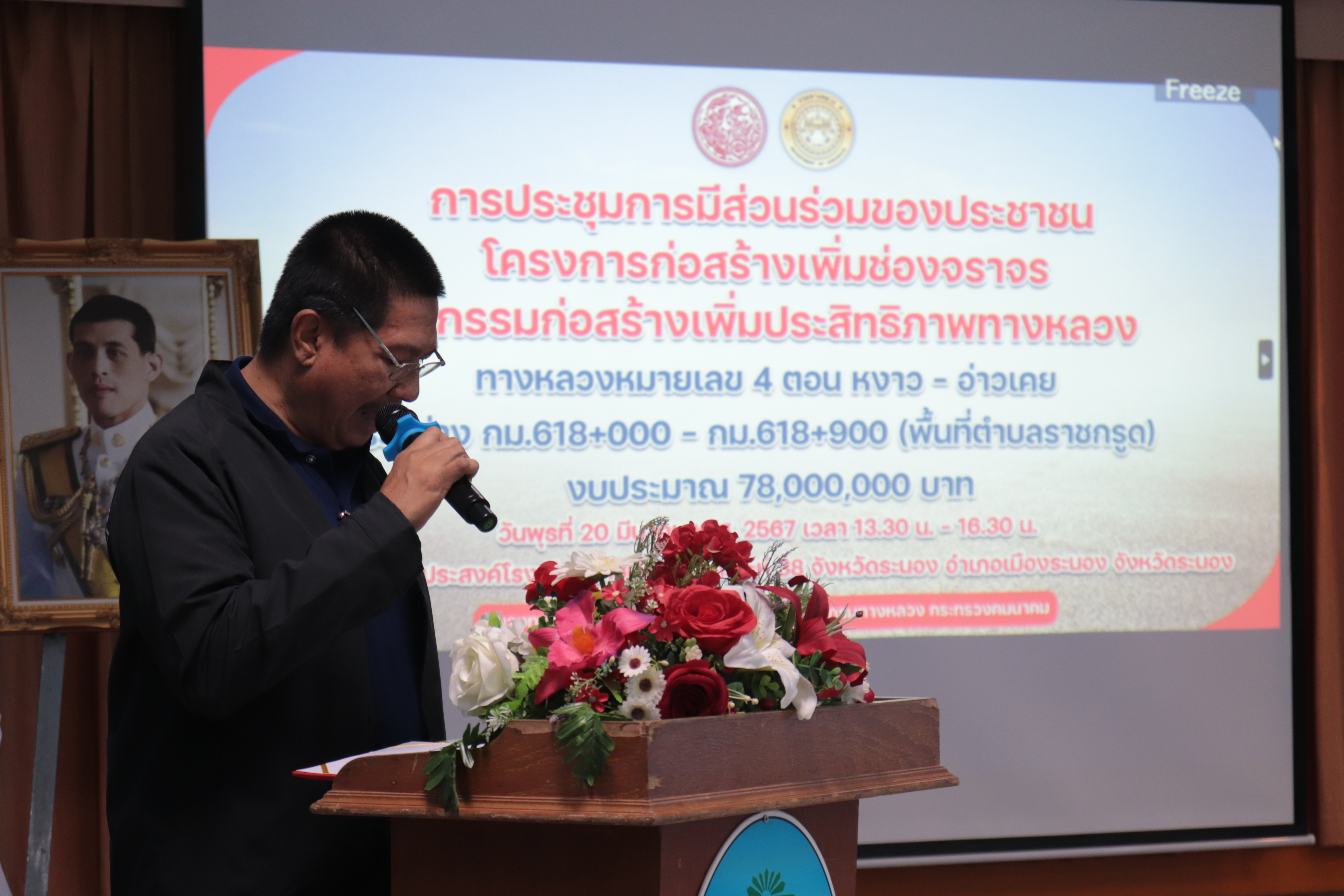ข้อมูลข่าว : ประชุมการมีส่วนร่วมของประชาชน โครงการก่อสร้างเพิ่มช่องจราจร กิจกรรมก่อสร้างเพิ่มประสิทธิภาพทางหลวง ทางหลวงหมายเลข 4 ตอน หงาว – อ่าวเคย ระหว่าง กม.618+000 – กม.618+900 (พื้นที่ตำบลราชกรูด) ณ อาคารอเนกประสงค์โรงเรียนราชประชานุเคราะห์ 38 จังหวัดระนอง อำเภอเมืองระนอง จังหวัดระนอง